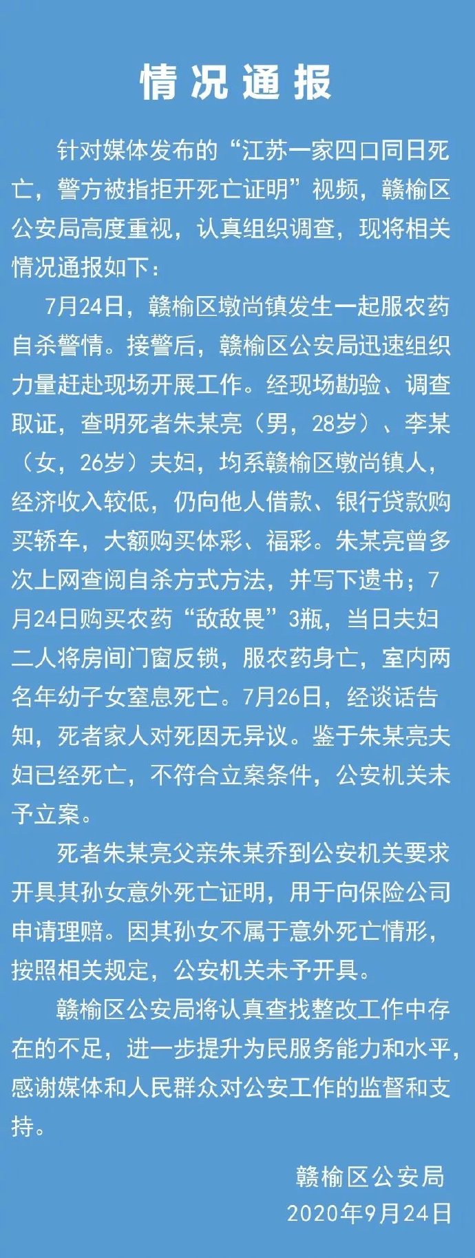 针对媒体发布的“江苏一家四口同日死,警方被指拒开死亡证明”视频,赣榆区公安局高度重视,认真组织调查,现将相关情况通报如下: