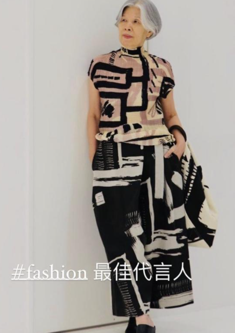 叶惠美脚踏一双黑色坡跟拖鞋,一头银发一丝不苟,她身上穿的都是那种比较宽松却又不失版型的套装。远远看去像是一幅画,图上这套抽象又不失质感,搭配类似款式的手提袋,走时装秀是完全没问题的。