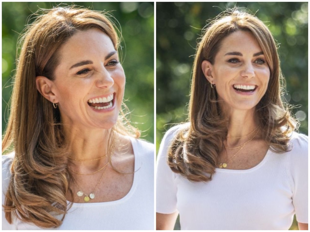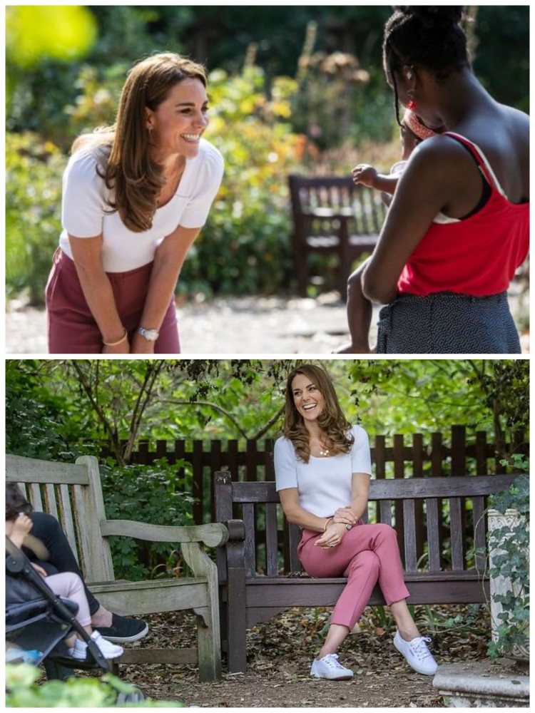 最近凯特王妃前往伦敦Battersea公园,参加一个与普通父母们交流疫情期间如何得到支持的活动。当天的她穿着非常平易近人,白色短袖针织上衣搭配粉色修身长裤,将上衣扎进裤子里,让身材比例看起来更好。脚上穿的是多年来一直很爱的Superga帆布小白鞋,整体看起来既舒服又青春。