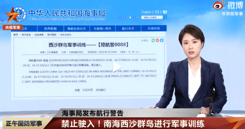 @央视军事 9月28日消息,中国海事局网站发布航行警告:9月28日至30日每天8时至18时,黄海南部部分海域进行实弹射击,禁止驶入。9月28日7时至18时30分,东海部分海域进行实弹训练,禁止驶入。9月28日7时至15时,南海西沙群岛有关海域进行军事训练,禁止驶入。9月28日5时至12时,渤海部分海域执行军事任务,任何船只不得进入。