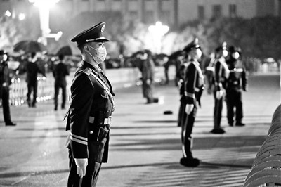 岳啸龙介绍,在10月1日凌晨1点之前,他和战友们就到达了国旗区西侧哨岗,此时,广场的围栏外已经聚集了很多游客。“同志您好,请站在护栏以外观看,谢谢合作。”“大家保管好自己的贵重物品,以防被盗。携带小孩的同志请照管好自己的孩子”……随着游客越来越多,岳啸龙不断提醒群众提高自我保护意识,竭尽全力维护着升旗仪式的现场秩序。