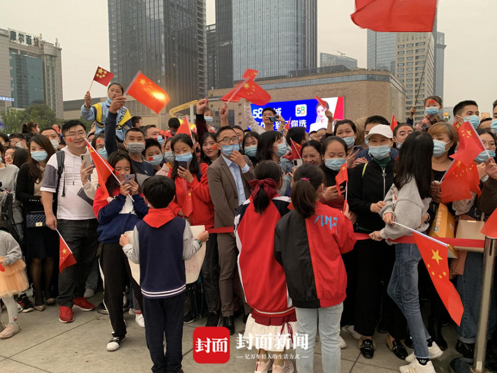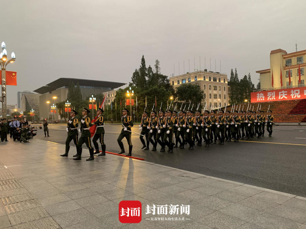 2020年10月1日上午6点57分,朦胧细雨中,成都天府广场上,观众们翘首等待升旗仪式的开始。