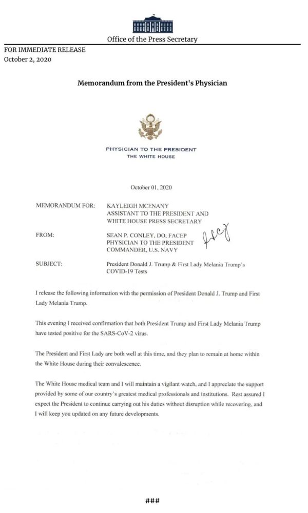 特朗普的医生向媒体介绍了总统夫妇目前的情况。白宫医生表示,特朗普在感染新冠病毒后将继续“不受影响”地履行职责。并发出报告证实,美国总统特朗普和夫人梅拉尼娅新冠病毒检测呈阳性。
