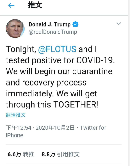 随后,据中国日报网10月2日10时许的报道,美国总统特朗普因为随行助手确诊新冠,已进行自我隔离,正在等待核酸检测结果。然而,直到北京时间10月2日12时许,海外传来消息,特朗普核酸检测呈阳性,现已确诊新冠。