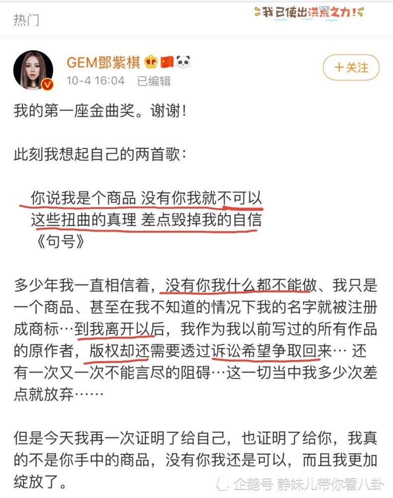 邓紫棋:我真的不是你手中的商品,隔空喊话前公司,没有你我一样可以,用金曲奖证明自己的实力。第31届金曲奖获奖名单3日晚揭晓,邓紫棋《摩天动物园》获评审团奖。