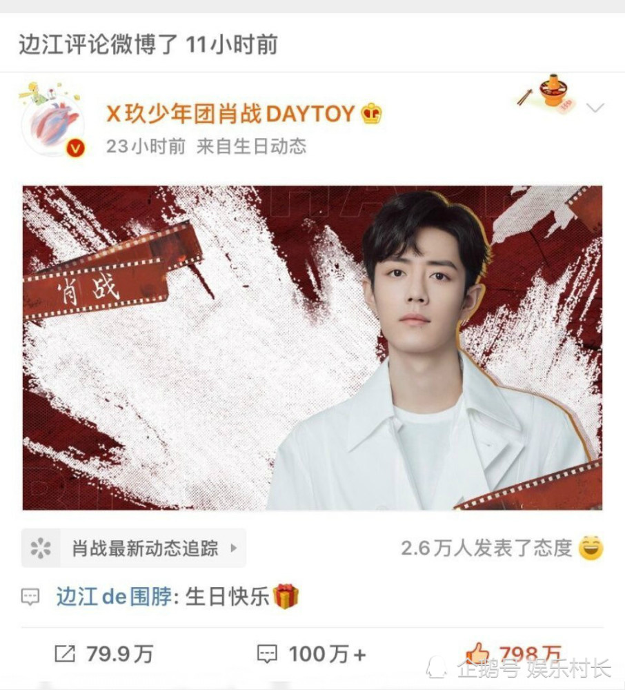 对于肖战,相信网友非常熟悉,去年《陈情令》火爆热播,肖战与王一博纷纷爆红,并且二人还产生了很多CP粉,在昨天肖战生日时博君一肖CP粉也下了血本,以肖战名义做了多个公益以及宣传等。值得一提的是王一博并未为肖战公开庆生送祝福,但是为《陈情令》蓝忘机配音的边江则送上了生日祝福,评论了一句“生日快乐”。