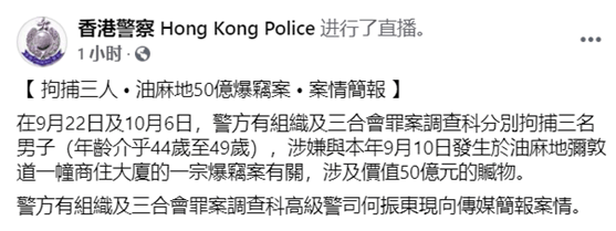 港媒报道称,警方表示,警方有组织及三合会罪案调查科在9月22日及本月6日分别拘捕3名男子,年龄在44岁至49岁。