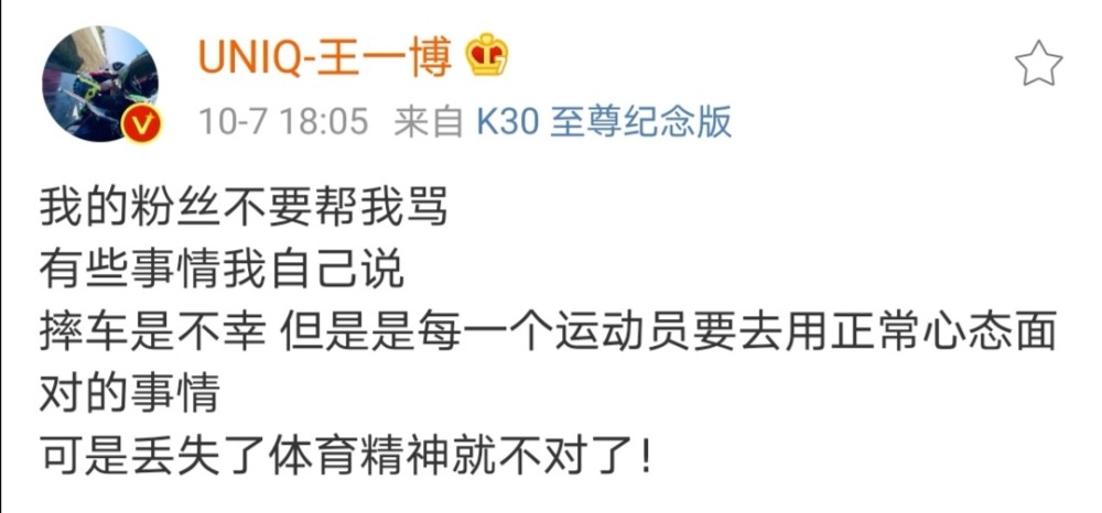 王一博只得中途离开赛场,确实很遗憾,但这就是比赛。不能因为选手是王一博就认为这是不公平的,就认定对方是故意的。王一博摔倒后,车子发不动,只是一个意外,如果车子发动了,不影响他继续参赛,或许他还有取胜的机会。