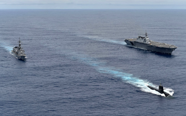 日本海上自卫队10月9日在南海开展反潜作战演练,出动了“出云”级直升机航母、“苍龙”级潜艇等先进舰艇。