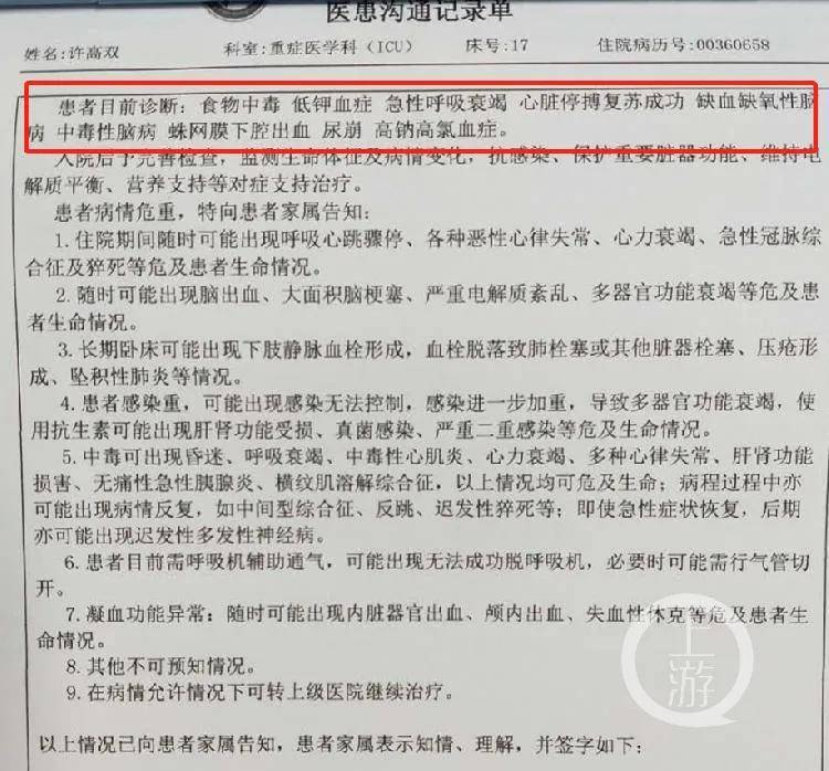 许高双的儿子许杰介绍,10月1日晚8时30分许61岁的许高双吃完晚饭,晚9时许开始出现上吐下泄,浑身无力等症状,当晚11时30分许,许高双被送至医院,医生初步诊断为急性肠胃炎,可回家休息。10月2日凌晨3时许,回到家中的许高双出现昏迷,再次被送至医院。仙桃市第一人民医院病例显示,许高双系食物中毒、低钾血症。