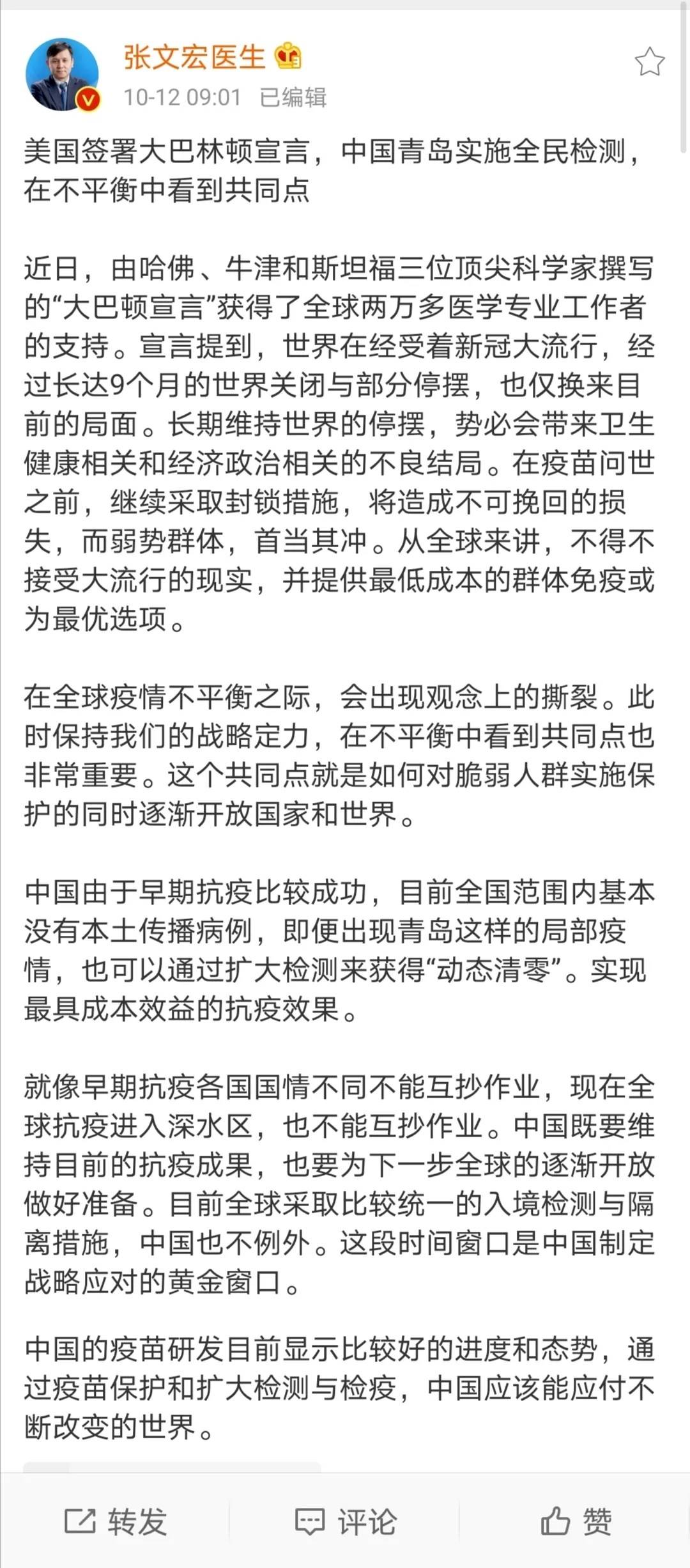 张文宏微博原文如下: