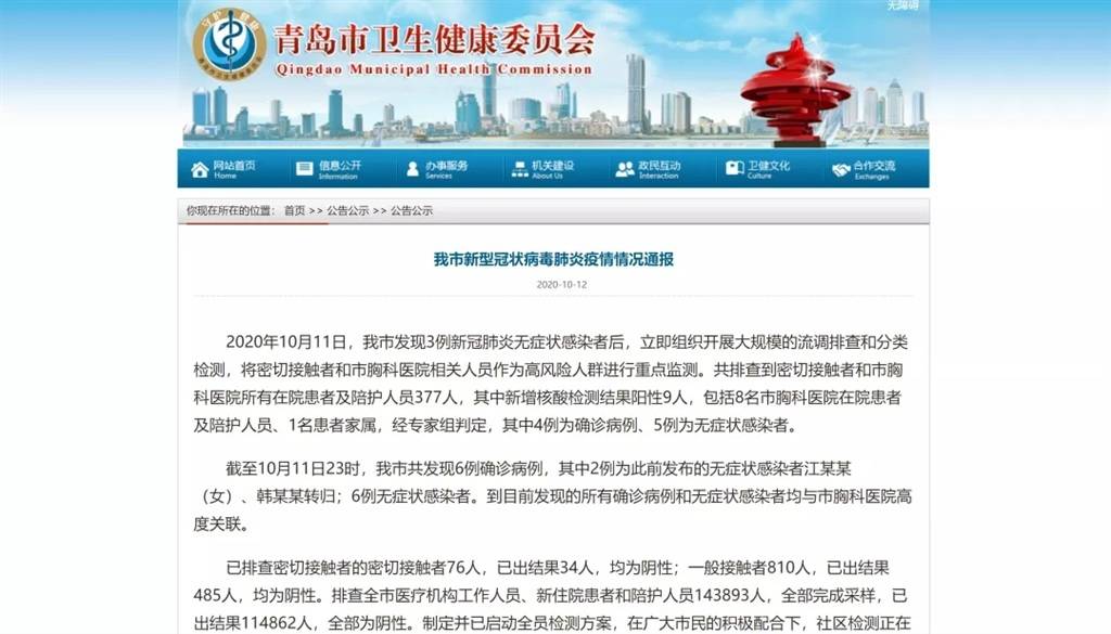 今晨,青岛市卫生健康委员会发布新型冠状病毒肺炎疫情情况通报称,截至10月11日23时,青岛市共发现6例确诊病例。青岛制定并已启动全员检测方案,5天内对全市检测全覆盖,检测结果将及时发布。