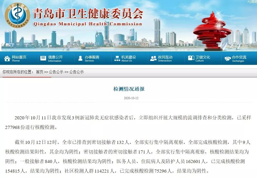 10月11日青岛发现3例新冠肺炎无症状感染者后,立即组织开展大规模的流调排查和分类检测,已采样277968份进行核酸检测。