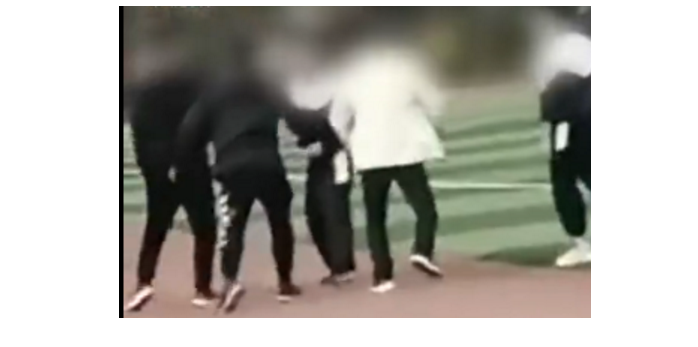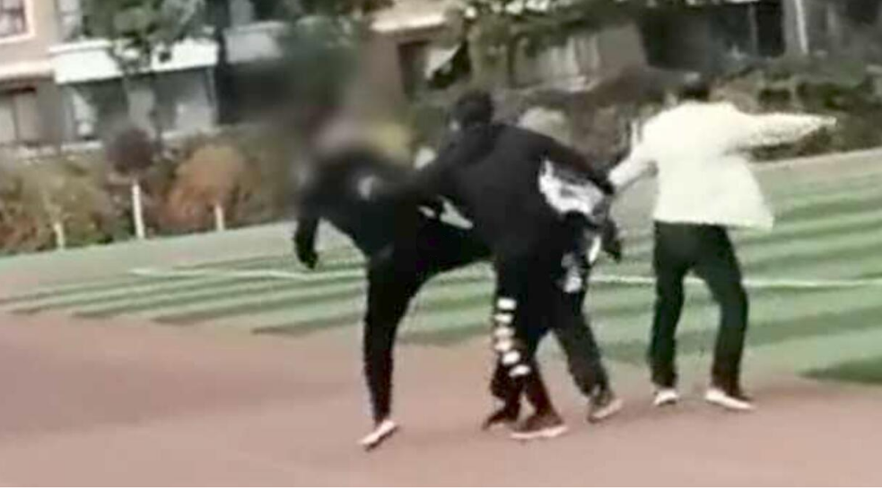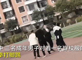 视频显示,三名成年男子对着一名穿校服的学生一阵拳打脚踢,多次飞踹男生腿部、背部。据该校彭老师称,确有此事,学校已经报警了,现在几个老师都在公安局里配合调查。