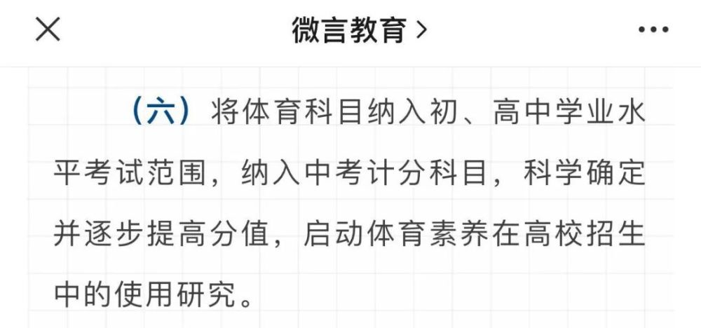 第一回,是国家体育总局9月发布的一则通知《体育总局 教育部关于印发深化体教融合 促进青少年健康发展意见的通知》中提到,“要加强学校体育工作,将体育科目纳入初、高中学业水平考试范围,纳入中考计分科目,科学确定并逐步提高分值,启动体育素养在高校招生中的使用研究。”