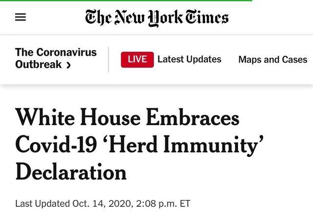 △《纽约时报》10月14日报道称,白宫支持 群体免疫宣言