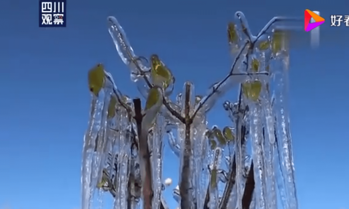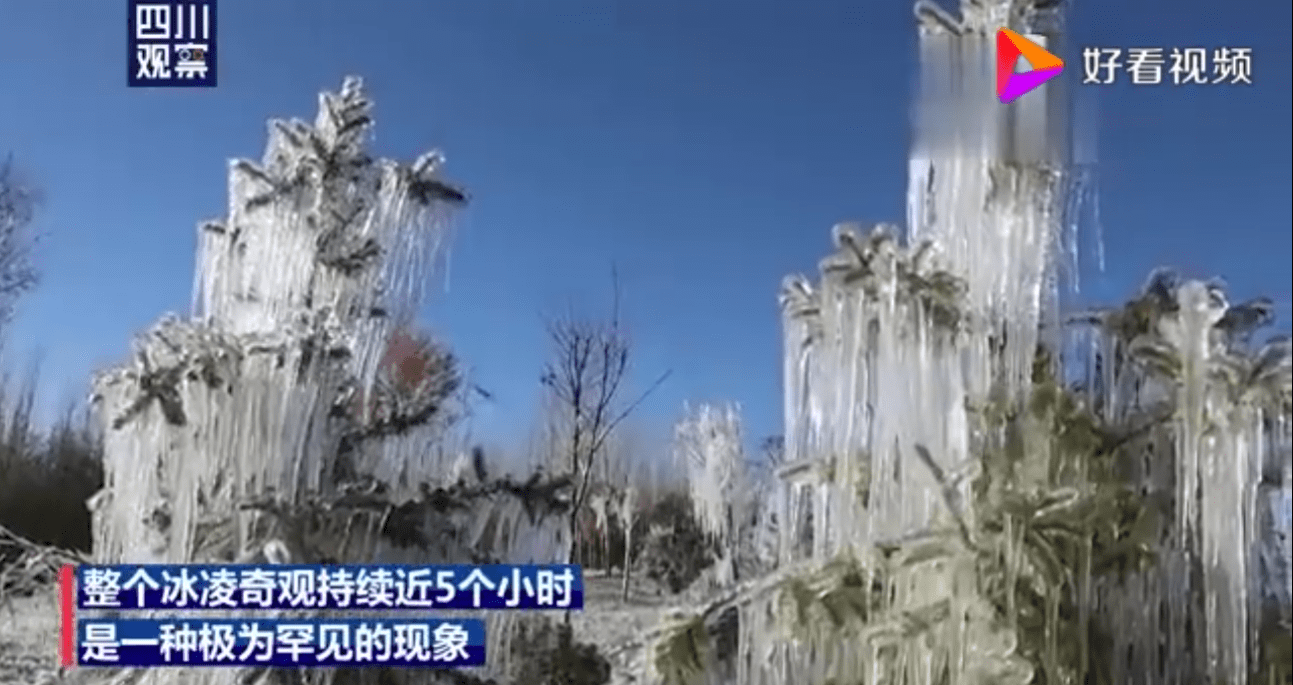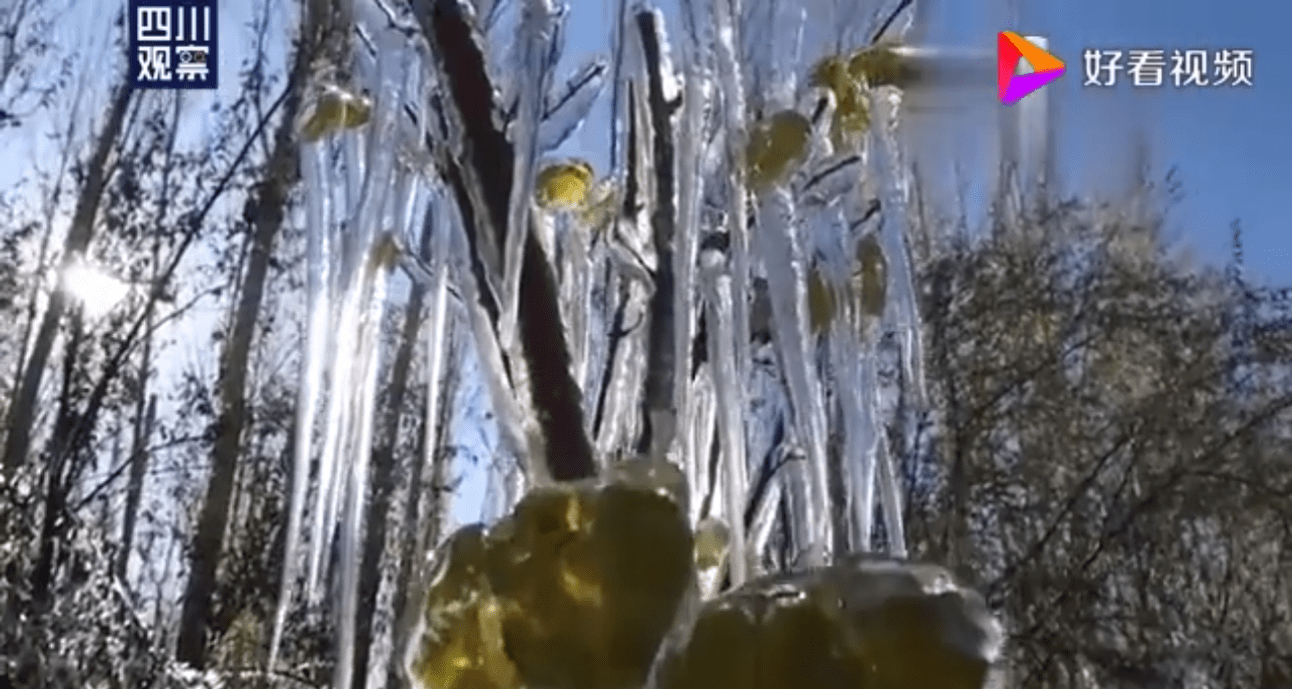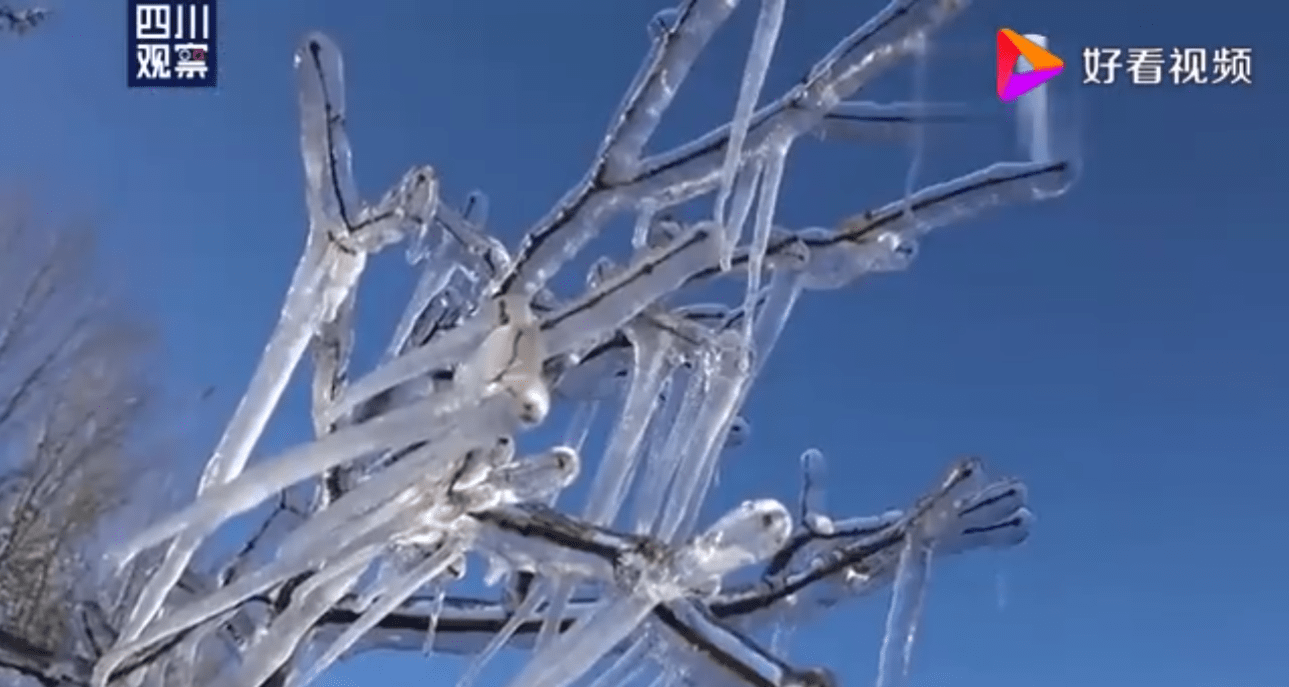 树枝则悉数被扎实的冰棍包裹起来,如同雾凇一般。