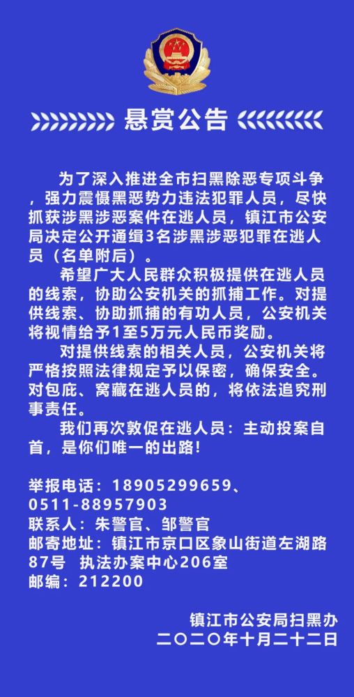 10月27日中午11点半左右,“平安镇江”发布悬赏公告,公开通缉3名涉黑涉恶犯罪在逃人员,希望广大人民群众积极提供在逃人员的线索,协助公安机关的抓捕工作。