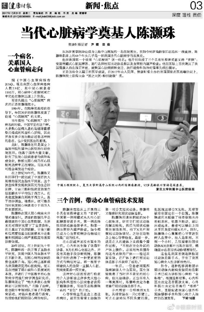 【痛惜!我国当代心脏病学之父陈灏珠逝世】今天凌晨3点09分,中国工程院院士、“当代心脏病学之父”陈灏珠院士在上海逝世,享年96岁。 陈灏珠,1924年生,曾任上海市心血管病研究所所长,中华医学会心血管病学会副主任委员等职。 他在我国第一个使用“心肌梗死”这一病名;他开创完成了三个具有里程碑式意义的“首例”:安置埋藏式心脏起搏器、施行选择性冠状动脉造影以及血管腔内超声检查;他在国际上首次确认了我国健康人的血脂正常值,就我国心脏病病种变迁、流行趋势和防治对策率先做出提示。 对于如何成为一名好医生,陈灏珠曾在首届国家名医高峰论坛(2017年度)上曾谈到,要医德高尚、医风严谨、医术精湛、热心教学、努力科研、终生学习,还要加上预防疾病促进人民健康、病后康复加强疾病管理这两条。