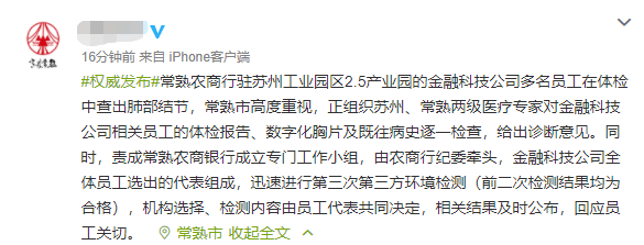原标题:常熟农商行多名员工查出肺部结节,官方通报