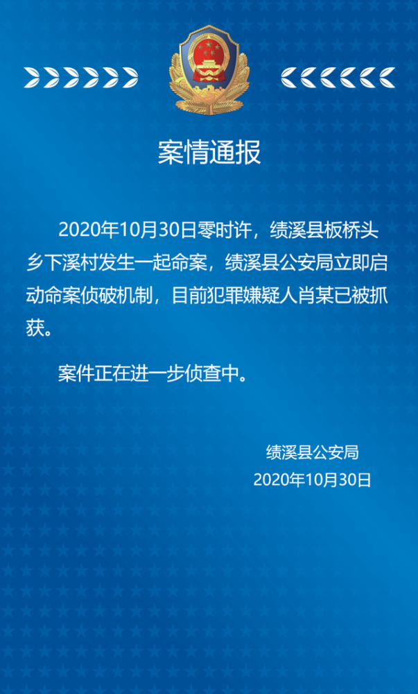 2020年10月30日零时许,安徽省绩溪县板桥头乡下溪村发生一起命案。据绩溪县板桥头乡政府消息,受害人章建军为中共党员、县教体局干部、绩溪县板桥头乡下溪村党支部第一书记、扶贫工作队队长。