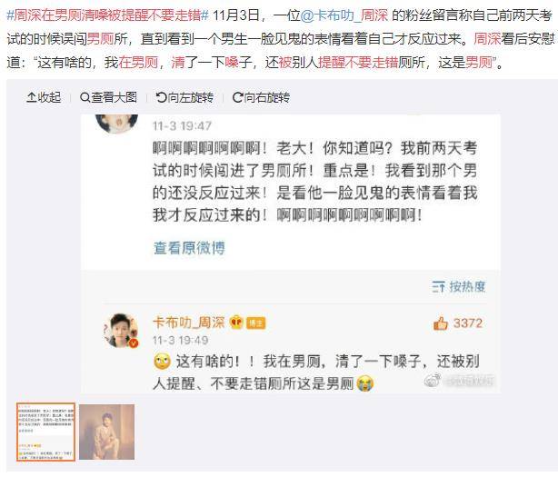 11月3日,周深在男厕清嗓,结果被粉丝误以为是误闯了男厕所。结果是大写的尴尬。还被周深安慰:“这有啥的,我在男厕,清了一下嗓子,还被别人提醒不要走错厕所,这是男厕”路人都觉得周深好宠粉丝啊!粉丝太幸福了吧又幽默又可爱!