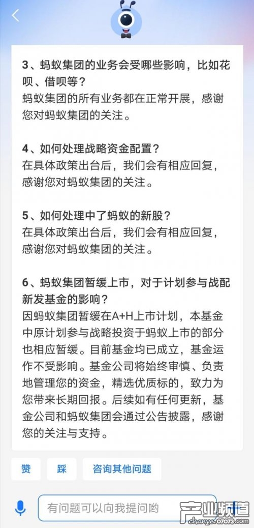 蚂蚁集团暂缓上市支付宝回应,蚂蚁集团重新上市或被推迟半年。11月3日晚间,上交所发布公告称,决定暂缓蚂蚁集团上市。投资者普遍关注,蚂蚁集团暂缓上市对计划参与战略配售的基金会产生哪些影响。对此,支付宝官方客服回应称,因蚂蚁集团暂缓在A+H上市计划,战略基金中原计划参与战略投资于蚂蚁上市的部分也相应暂缓。目前基金均已成立,基金运作不受影响。