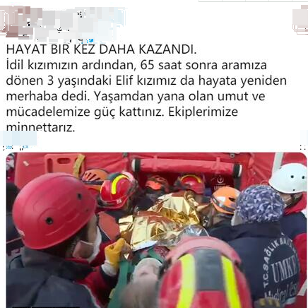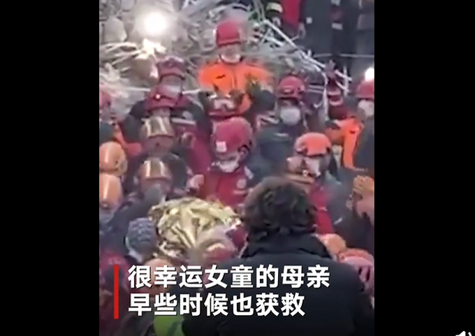 土耳其发生6.9级地震,造成土耳其和希腊上千人伤亡。地震重灾区土耳其西部城市伊兹密尔传出好消息,3岁女童埃利夫·佩林塞克(Elif Perincek)受困65小时后奇迹获救。画面显示,人们将女童从倒塌公寓大楼的瓦砾堆中救出,她的身体被金色铝箔保温毯包裹着,现场响起掌声。据报道,女童的母亲、一对10岁大的双胞胎姐姐、7岁的哥哥已于震后23小时获救。但她的哥哥送医后不治。
