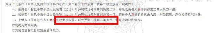 最终四川省高级人民法院二审认定,在审理期间,袁某有认罪悔罪表现,并愿意赔偿家属经济损失,宣判撤销原一审判决,以故意杀人罪判处袁某死刑,缓期二年执行,剥夺政治权利终身。