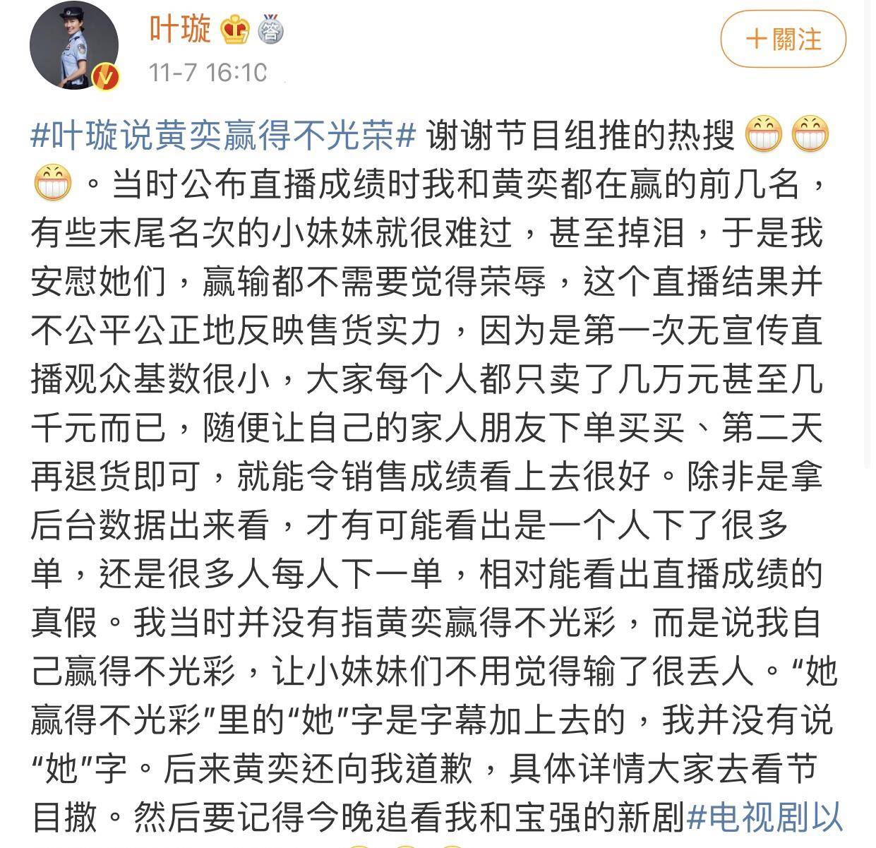 原标题:叶璇呛声黄奕赢得不光荣,本人回应了,又是节目组搞事?