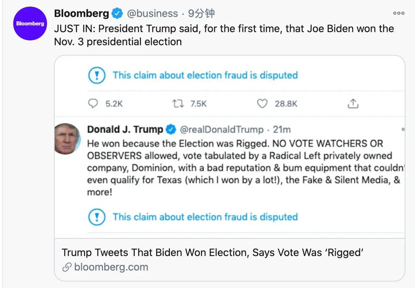特朗普此前在推特上称,“他(拜登)之所以获胜,是因为选举被操纵了。”彭博社随后在推特上发布消息称,这是特朗普首次说“拜登赢得11月3日总统选举”。