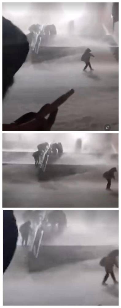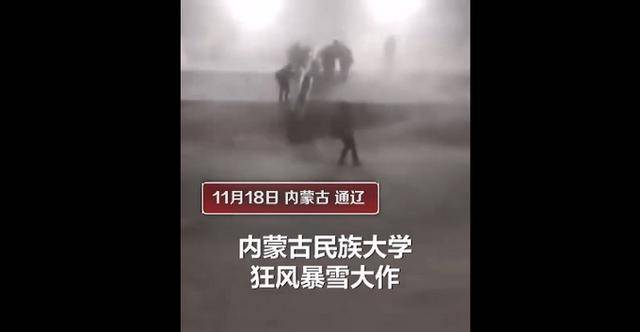 【大学生在校园内被狂风暴雪吹走】11月18日,内蒙古自治区通辽市科尔沁区,西拉木伦大街西996号内蒙古民族大学,狂风暴雪大作,有一名学生硬生生被吹着走,其他的同学紧握栏杆防止被吹走。