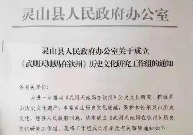 11月19日,一份灵山县人民政府办公室关于成立《武则天她妈在钦州》历史文化研究工作组的通知流传网络,引发热议。
