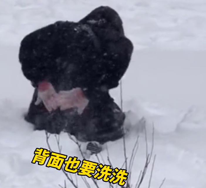 随后又穿上衣服,跪在雪地中,抓起一把雪清理大衣帽子