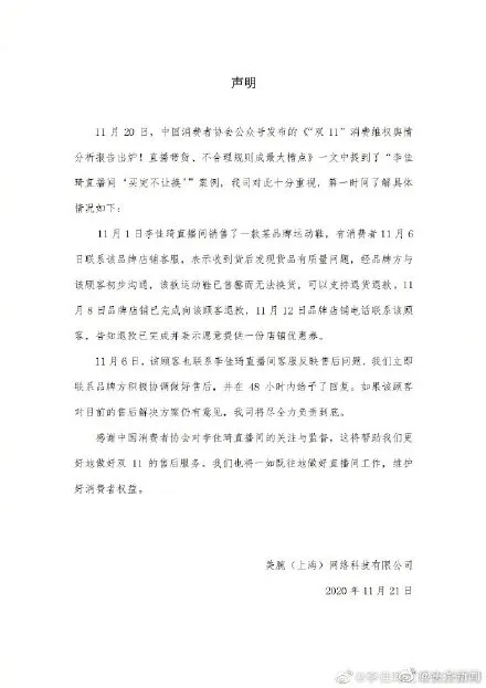 【#李佳琦方回应买完不让换#】11月21日,针对中国消费者协会发布的 双11 消费维权舆情分析报告中案例:李佳琦直播间 买完不让换 ,@李佳琦直播官方微博回应称,顾客曾在11月6日将问题反映给品牌方和李佳琦直播间,厂商因为当时货品已售完无法换货,进行了退款,直播间一直与品牌方积极协调做好售后。如果对目前的售后解决方案仍有意见,会负责到底。