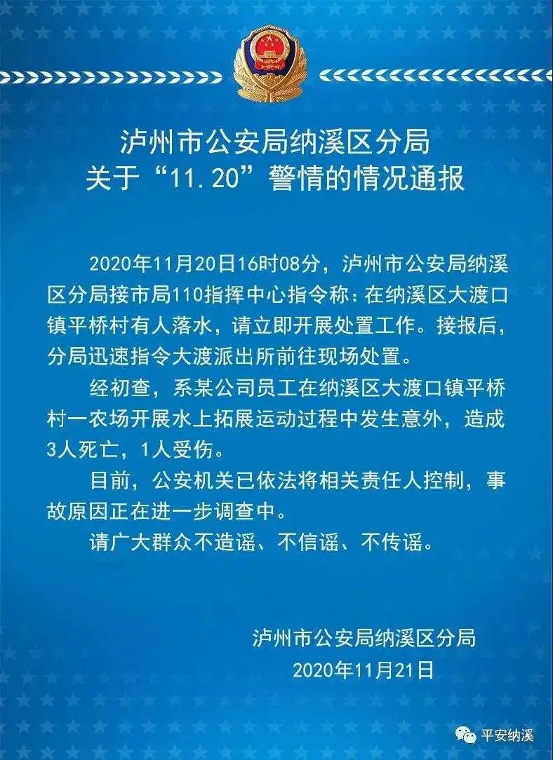 泸州市公安局纳溪区分局11月21日通报,11月20日16时8分,泸州市公安局纳溪区分局接市局110指挥中心指令称:在纳溪区大渡口镇平桥村有人落水,请立即开展处置工作。接报后,分局迅速指令大渡派出所前往现场处置。经初查,系某公司员工在纳溪区大渡口镇平桥村一农场开展水上拓展运动过程中发生意外,造成3人死亡,1人受伤。