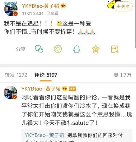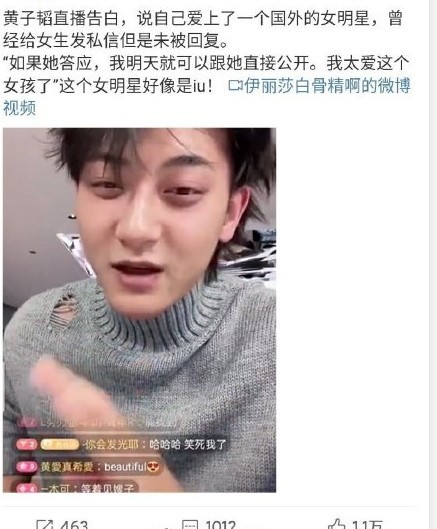 黄子韬在直播中提到自己喜欢一个国外女孩,“如果她明天就答应我,我明天就可以跟她公开,我立马原地娶她”,他表示自己曾给对方发过私信,但没有得到回复,还在微博发文强调:“我不是