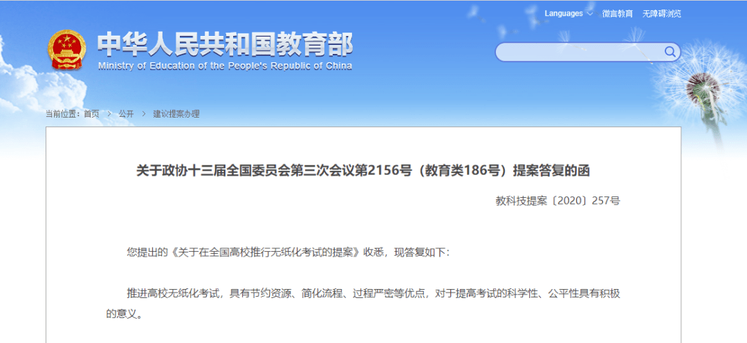 您提出的《关于在全国高校推行无纸化考试的提案》收悉,现答复如下: