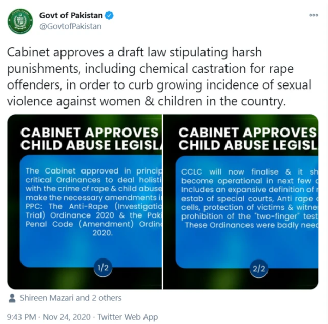 【巴基斯坦批准化学阉割强奸犯】11月24日晚9点43分,巴基斯坦政府在其官方推特上发布了一则声明。声明称,巴基斯坦内阁批准了一项立法草案,草案中规定了严厉的刑罚,其中包括对强奸犯进行化学阉割,以此遏制巴基斯坦境内不断增长的针对妇女、儿童的性侵案件。