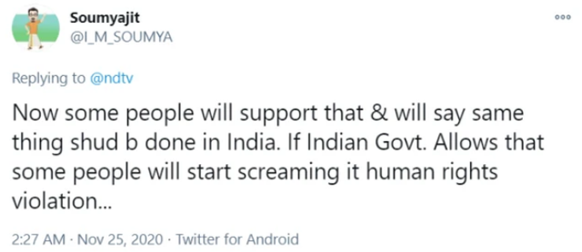 ▲现在一些人说支持在印度采取同样的措施。一旦印度政府批准了,又会有人开始叫嚣这是侵犯人权了。
