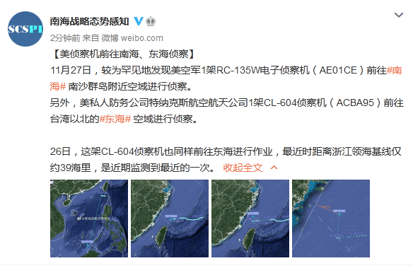 原标题:南海战略态势感知:美侦察机前往南海、东海侦察