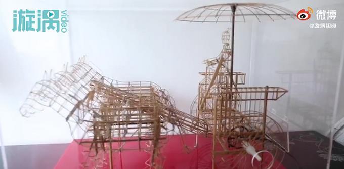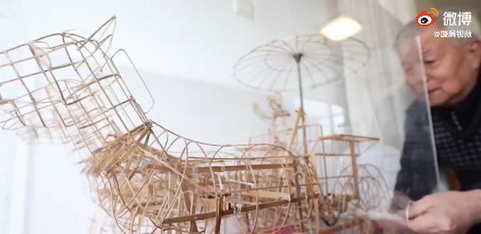 西安83岁的张天伟花费4个月时间,用900多根竹条,3000多个绑扎,做了一辆长秦始皇陵兵马俑一号战车的动态模型。视频中,战车的4匹马以及牵绳的士兵可以灵活动起来,士兵佩戴的剑以及弓弩均可取下。