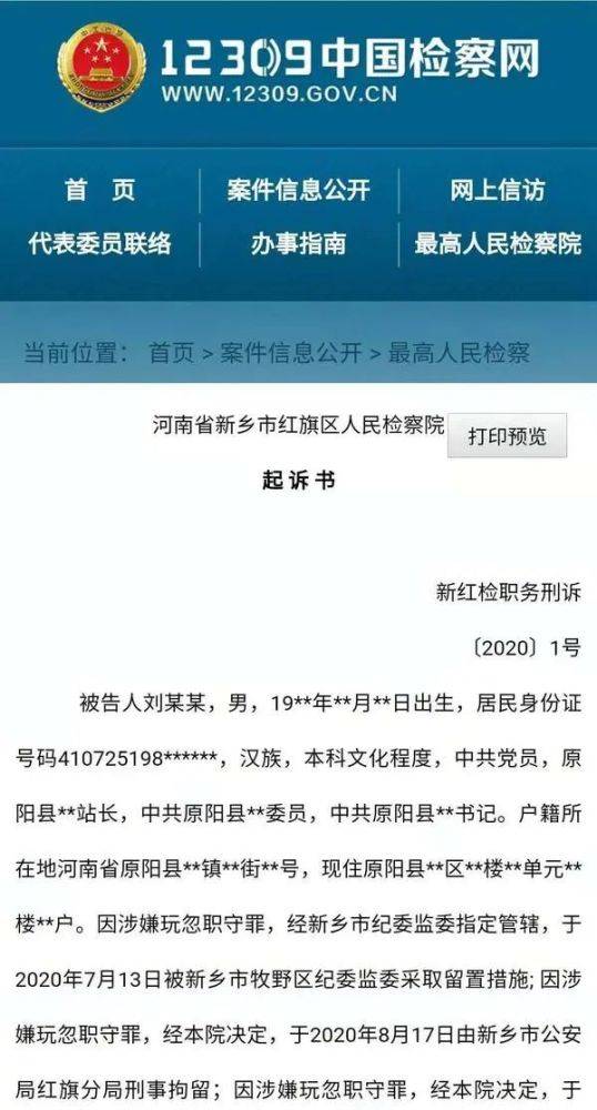 11月27日,新乡市红旗区人民检察院公布的起诉书显示,原阳县建筑工程质量监督站站长刘某某,工作中严重不负责任,收受他人财物后,为徇私情玩忽职守,致使国家和人民利益遭受重大损失,检察院以玩忽职守罪向法院提起公诉。