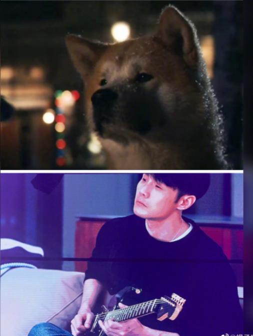 照片中,李荣浩身着黑色短袖,手里抱着一把吉他,头微微倾斜抬高,眼睛看向一旁,和柴犬的神态颇为相像,尤其是一双忧郁的小眼睛和柴犬十分神似。