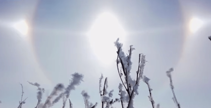 11月18日,在黑龙江漠河,天空出现幻日奇观,好似出现 3个太阳 。