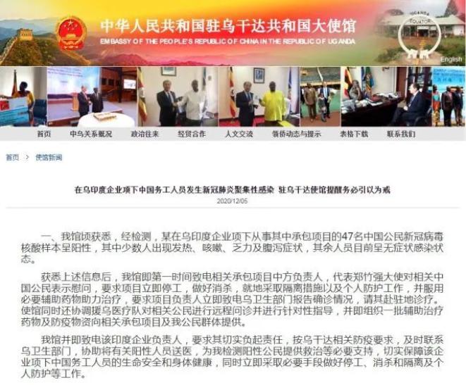 中国驻乌干达大使馆网站12月5日公告称,在乌印度企业项下中国务工人员发生新冠肺炎聚集性感染,使馆提醒务必引以为戒。