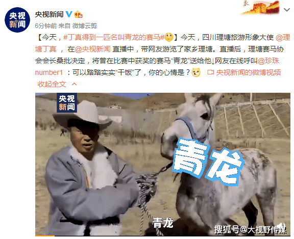 今天,四川理塘旅游形象大使 @理塘丁真 , 在@央视新闻 直播中,带网友游览了家乡理塘。直播后,理塘赛马协会会长桑批决定,将曾在比赛中获奖的赛马“青龙”送给他↓网友在线呼叫@珍珠number1 :可以踏踏实实“干饭”了,你的心情是?