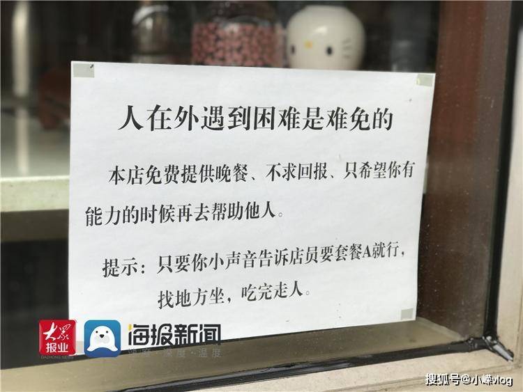 大众网·海报新闻记者看到,在这家饭店的一面玻璃右下角,贴着一张暖心告示,上面写着:人在外遇到困难是难免的,本店免费提供晚餐,不求回报,只希望你有能力的时候再去帮助他人。提示:只要你小声音告诉店员要套餐A就行,找地方坐,吃完走人。