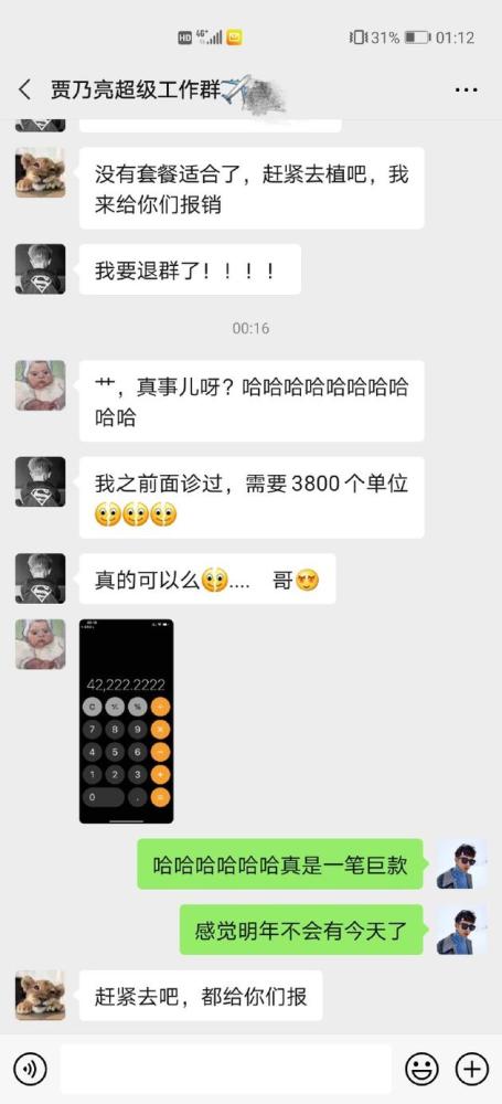 12月12日凌晨,贾乃亮突袭员工群,表示大家跟着自己头发越来越少,所以今年要送一点特别的礼物。他还让员工拍了自己的额头照,检查发际线,实施情况确实有些惨不忍睹。贾乃亮看后也是赶紧催促员工去植发,钱他都报了。
