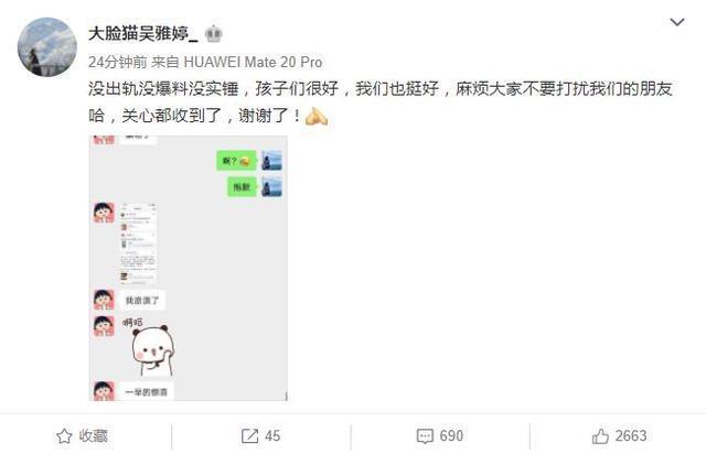 12月15日,吴雅婷晒出和张佳宁的聊天记录截图辟谣,表示“没出轨没爆料没实锤,孩子们很好,我们也挺好,麻烦大家不要打扰我们的朋友哈,关心都收到了”。在聊天记录中,张佳宁表示自己崩溃躺枪了,吴雅婷表示“真没出轨,说了又没人信”。